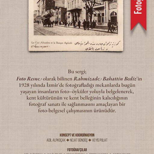 Elinizde tuttuğunuz bu kitabı üreten ana fikrin kaynağı, işte bu kitaptır. Foto Resne’nin sahibi Rahmizade Bahattin Bediz bundan doksan yıl öncesinin İzmir’ini fotoğraflayarak tarihe bir belge bırakmıştır. Bizler bugün yaşadığımız İzmir’de, Foto Resne’nin fotoğrafladığı mekanların, yaşanmışlıklarını bugün yaşayanların yaşamlarından kesitler vererek aktarmak, bu yolla kent belleğine ve kent kültürüne katkı sağlamak istedik.