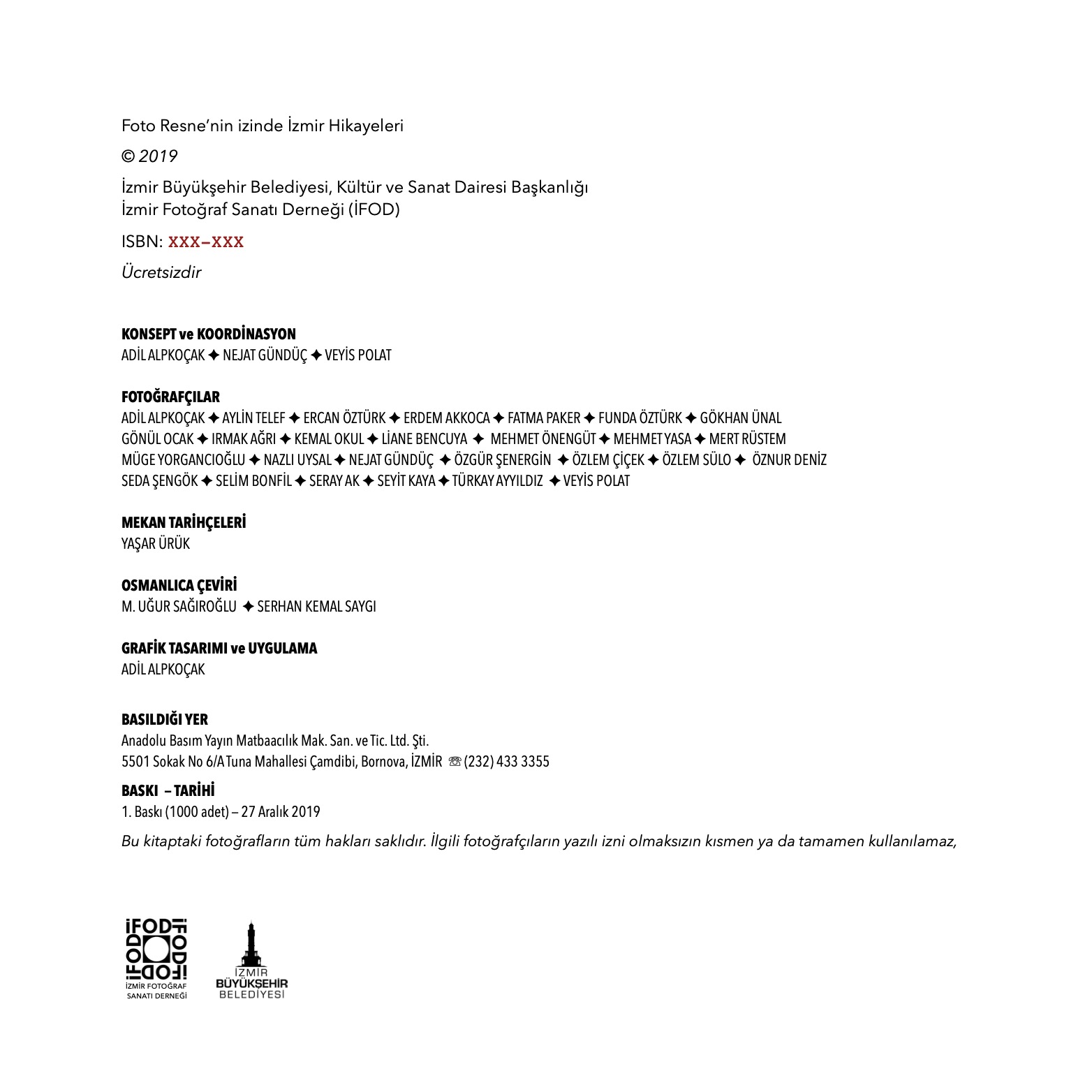 İzmir Büyük Şehir Belediyesi (İBB)’ne üç farklı fotoğraf projesi önermemizin ardından on beş aylık bir süre geçti. Bu süre içerisinde, fotoğrafçı ve tarihçilerden oluşan kalabalık bir ekip ile birlikte yoğun bir çalışma temposunda keyifle çalıştık ve sona ulaştık. Projelerin hepsi metinlerle desteklenmiş görsel hikayeler içeren foto-öykü formatındadır ve her üç projenin de temelinde kent, mekân ve insan üçlemesi yatar.
